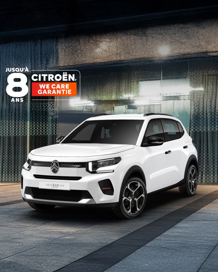 de 21 200 € ou 129 € HT/mois (i) (1) Crédit-bail sur 48 mois et 40 000 Km d’une Citroën ë-C3 Société Électrique 113ch, boîte automatique, VAN neuve, avec option Pack Business, au prix de 23 625 € HT (tarif Citroën VU 09/25). 1er loyer à la livraison de 8 674 € HT, suivi de 47 loyers mensuels de 129 € HT, hors prestations facultatives. Option d’achat finale en cas d’acquisition de 10 281 € HT. Les clients éligibles bénéficient d'une Prime CertiNergy*de 4 900 € affectée au paiement du 1er loyer. Offre non cumulable, réservée aux professionnels (hors loueurs, administrations, collectivités locales, flottes et protocoles nationaux), dont le parc automobile total est au maximum de 100 véhicules , pour le crédit-bail du véhicule précité avec engagement de reprise par votre point de vente pour le montant de l’option d’achat finale, conditionné à un kilométrage contractuel maximum de 40 000 km et à un état standard, valable du 01/12/25 au 31/12/25, dans les points de vente du réseau Citroën participants, et sous réserve d’acceptation par CREDIPAR, SA au capital de 138 517 008 €, RCS Versailles n° 317 425 981, 43 rue Jean Pierre TIMBAUD 78300 POISSY, mandataire d’assurance n° ORIAS 07 004 921 (www.orias.fr), n° ADEME FR231747_03GHJZ. *Prime CertiNergy pour la valorisation des opérations au titre du dispositif des Certificats d’économies d’énergie non soumise à la TVA. (n° SIREN CertiNergy : 798 641 999). Véhicule éligible au programme CITROËN WE CARE de garantie jusqu’à 8 ans ou 160 000 km. Les conditions générales du programme CITROËN WE CARE sont disponibles dans le réseau CITROËN et sur Citroën.fr.